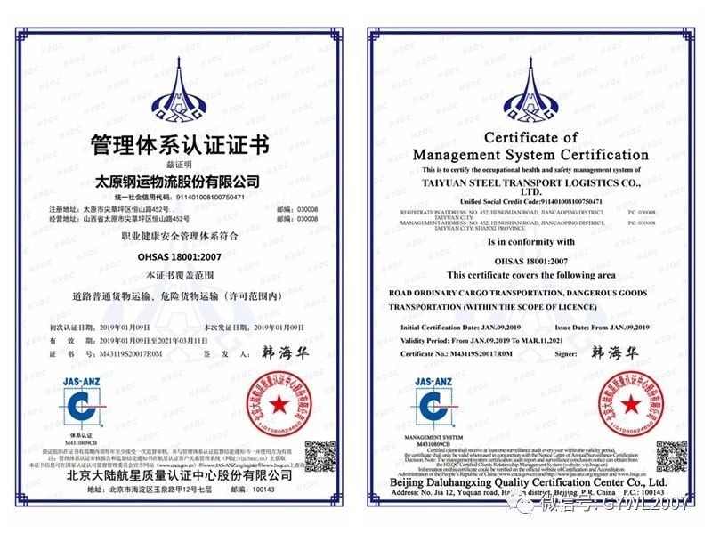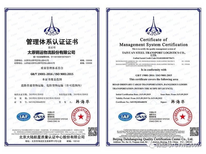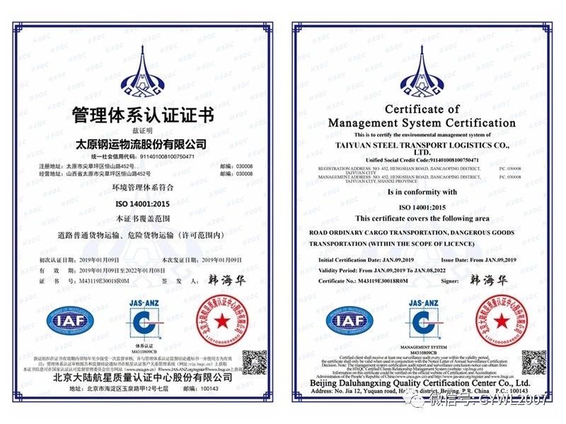 2019年1月,公司通過ISO9001質量管理體系、ISO14001環境管理體系、ISO18001職業健康安全管理體系認證。ISO三標一體認證的通過,標志著公司始終踐行推進冶金物流服務本質,持續強化以用戶為中心的服務理念;充分反映公司全力打造綠色****物流企業發展規劃的堅定決心,同時通過提高職業健康安全管理水平、優化管理流程、完善管理體系、規范作業標準等手段提升公司競爭力,為公司開拓市場、永續發展提供了有力保障。